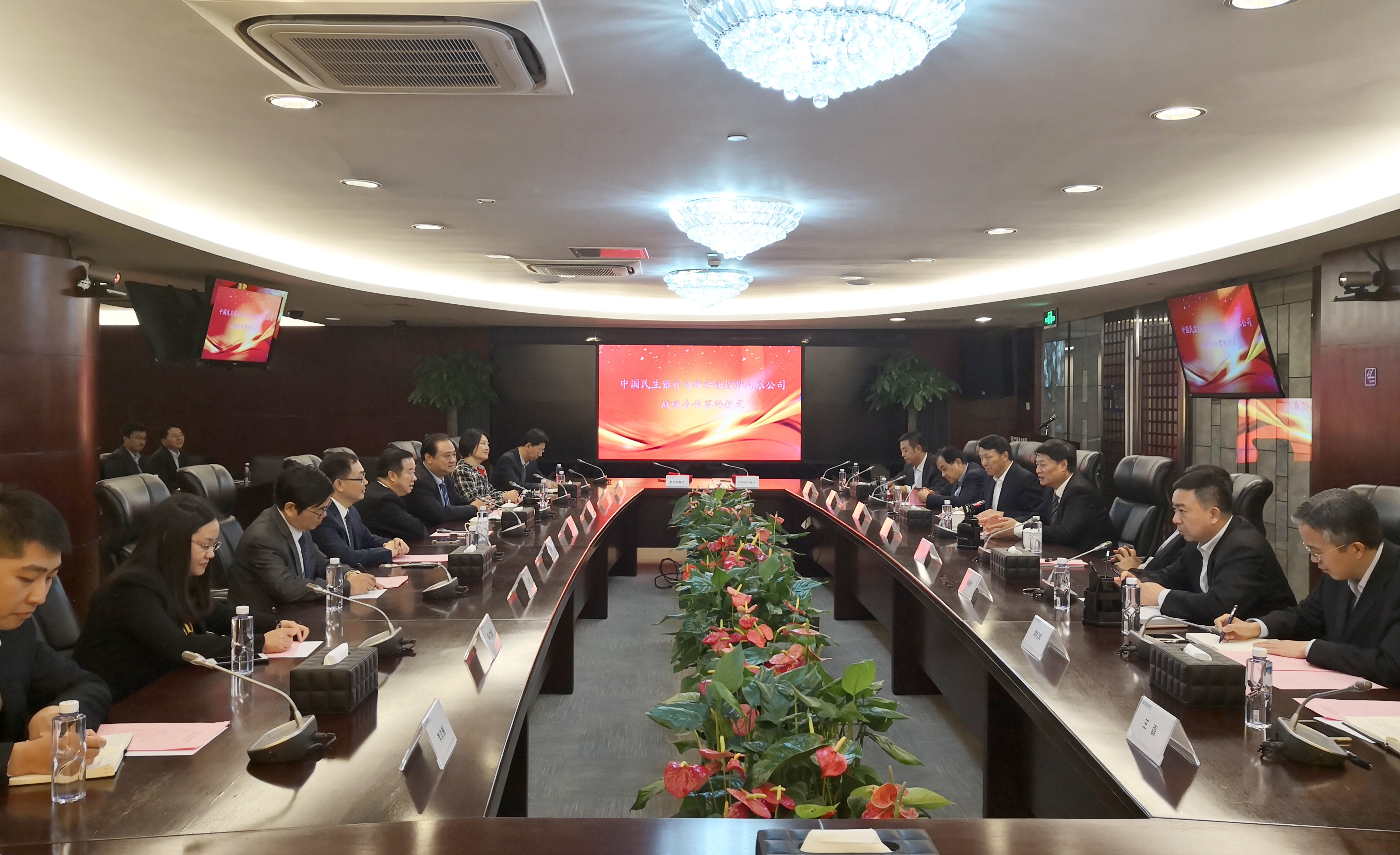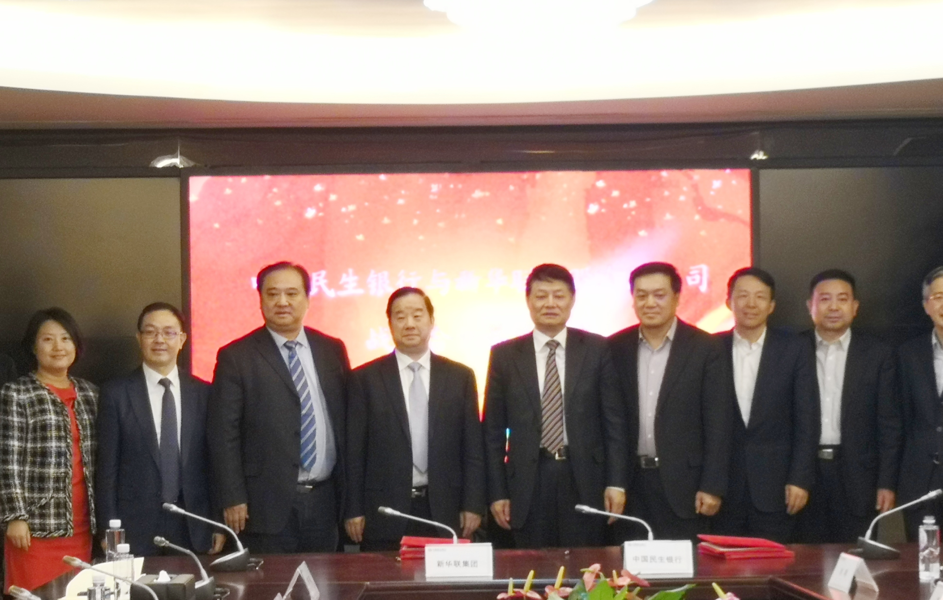 12月3日下午,中國民生銀行與新華聯集團戰略合作協議簽訂儀式在北京中國民生銀行大廈北樓舉行。新華聯集團董事局主席兼總裁傅軍,高級副總裁馮建軍、張必書、劉靜,高級助理總裁楊運輝等與中國民生銀行董事長洪崎,副行長石杰,北京分行黨委書記楊毓,總行公司業務部總經理陳煥德、投資銀行部總經理韓峰、公司業務風險管理部總經理黃紹輝、公司業務部副總經理尚明,北京分行副行長王磊等共同出席了簽約儀式。